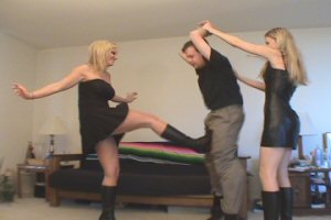 | Victoria Shows Dawn How to Bust Balls Part One | | Victoria and Dawn are together sitting on the couch when Victoria decides that they should gang up on her friend who is stopping by. Unfortunately for him, they are both wearing some very hard black kicking boots. During the clip, Victoria shows Dawn some of her favorite ballbusting techniques. Dawn shoes some hesitation when trying some of them, asking if these will hurt their kicking partner. Victoria just smiles and says that "he can take it...Besides he is here for us to enjoy." Victoria and Dawn take turns ramming their hot black boots into his soft balls. They alternate holding him and kicking him so there is constant ballbusting action. | Format: WMV Size: 85 MB Resolution: 720 x 480 Buy Now Download